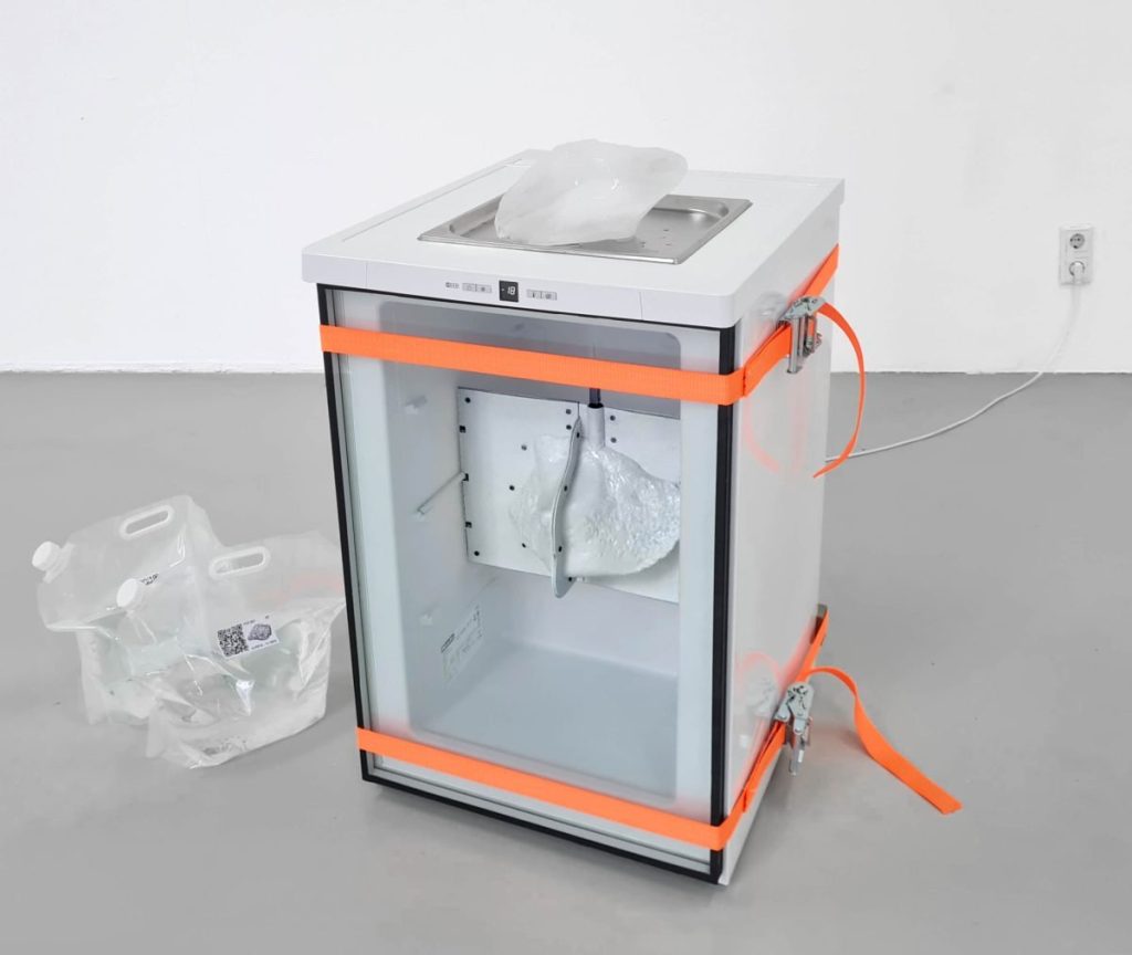 Für seine installative Arbeit „Tauwetter“ (2021–2023) befragt auch der Künstler Planetary Intimacies technoökologische Unterwerfungsverhältnisse anhand des Sujets des Gletscherschwundes. Der Künstler reiste nach Island und entnahm dem dortigen Ökosystem ein Stück Gletschereis, wobei er den Prozess – und damit u.a. auch die Schönheit der Eislandschaften – fotografisch dokumentierte. Für die Installation platziert er das Eis in einer räumlich geschlossenen Ausstellungsumgebung auf einem Gefrierschrank, der wiederum einen 3D-gedruckten Kunststoffabguss desselben Gletschereises enthält. Durch die Umgebungswärme schmilzt das Eis, sickert langsam durch einen Schlauch in die Kunstoffform ein und gefriert im Schrank erneut. Gleichzeitig verdunstet es außerhalb des Gefrierschranks sukzessive und vermag somit seine technisch reproduzierte ‚ursprüngliche‘ Form immer weniger auszufüllen, bis es endgültig verschwunden ist. Somit vernichten der menschliche Eingriff sowie der Wunsch, es als ästhetisches Objekt darzubieten, auch hier das Eis in seiner eigentlichen Gestalt. In diesem installativen Werk wie auch bei Poschmann ist man als Rezipient:in also konfrontiert mit dem begehrenden Schauen auf das ästhetisierte Eis, ebenso wie mit einem potenziell zerstörerischen Verlangen nach Verfügungsgewalt.