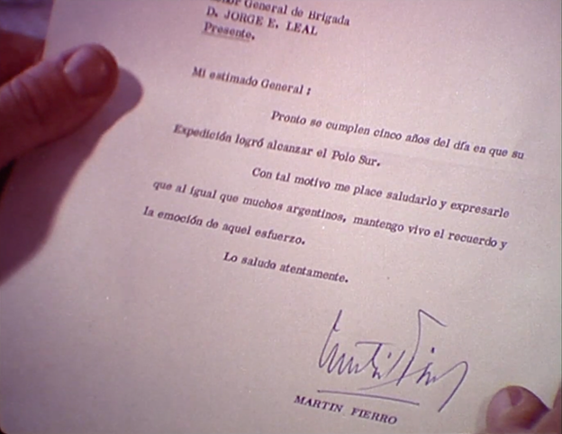 The Argentine documentary short Marcha al límite austral de la patria (1969), meanwhile, commemorates the military’s first overland expedition to the South Pole, in 1965. Here, the filmmakers appropriate the literary genre of the gauchesque – a traditional form of heroic, epic poetry about the gauchos of Argentina’s hinterlands, which contributed to the founding myths of the Argentine nation – to tie the military’s “conquest” of Antarctica to previous state occupations of lands inhabited by indigenous people. The film shows General Jorge Leal, who led the South Pole expedition, receiving a letter of congratulations supposedly signed by Martín Fierro, the main character of José Hernández’s eponymous 1872 gauchesque poem. The implication is that Leal is a sort of modern-day gaucho, a pioneer in the “Argentinization” of the so-called “white continent”.