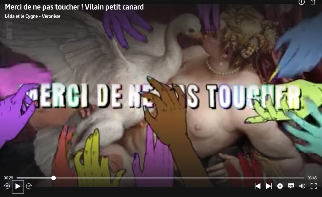 - Intermedialität meint hier nicht nur die Verwendung unterschiedlicher medialer Präsentationsweisen zur Bereicherung der Performance. Die Serie beweist vielmehr ein geschärftes Bewusstsein für Fragen der Medienpraxis und Mediengeschichte, die relativ eigenständig, gewissermaßen im Off der Bildanalysen verhandelt werden. Exemplarisch und besonders eindringlich nacherzählen lässt sich das entlang des Auftakts der Leda-Folge. Das erste Bild zeigt Veroneses „Leda und der Schwan“ als leicht aus der Zeit gefallenen Bildschirmhintergrund. Im nächsten Moment wird das digitale Stillleben durch einen Skype-Call in Unruhe versetzt. Eine spürbar verkaterte Hortense macht sich wie gewohnt an die Aufgabe, ins Bildthema einzuführen, hier die berühmte Szene aus Ovids Metamorphosen, in der sich Zeus, der Harvey Weinstein des Olymps, ein weiteres seiner unzähligen Opfer gefügig macht. Der schleppende Einführungsversuch wird zum Glück der Dozentin abrupt abgeschnitten von dem elektropoppigen Intro, das ein Rudel aus Comic-Händen über den Veronese schneidet, die das Bild (im Einspruch gegen die kunstbürgerliche Verhaltensregel) betasten, befummeln, befingern (vgl. Abb. 1). Nach dem Intro, das nur ein paar Sekunden dauert, erscheint eine neue Hortense in bester Verfassung: frisch geduscht, sauber gekleidet, begeistert und wieder begeisterungsfähig. Auf den Kostümwechsel reagiert eine veränderte Bildregie: Hortense ist nun nicht mehr verkleinert ins Skype-Fenster eingekapselt, sondern nimmt, harmonisch eingefügt in einen makellos kuratierten, jederzeit vorzeigbaren Wohnraumhintergrund, den ganzen Bildraum ein. Damit erzählt die Episode, noch bevor sie sich dem eigentlichen Thema widmet, eine andere kleine Geschichte, und zwar die eines nicht unbedeutenden Wandels im digitalen Kommunikationsverhalten der letzten Jahre: von den unterspannten, ständig stockenden Video-Calls der Generation Auslandsjahr zum durchgefilterten Konferenz-Verhalten im (post)pandemischen Zeitalter. Anders gesagt: die Ablösung von Skype durch Zoom.
