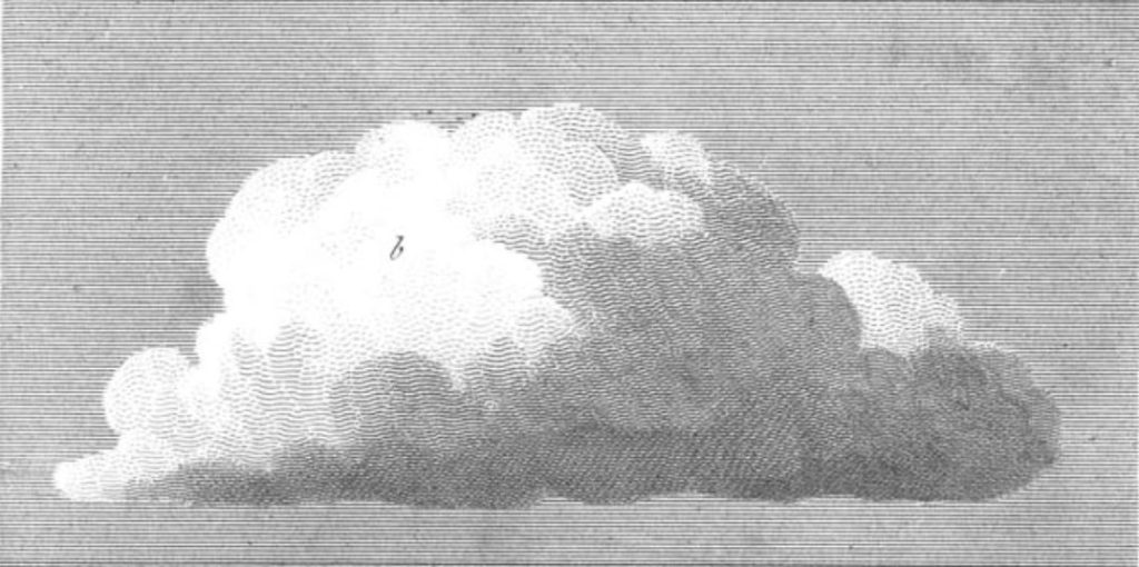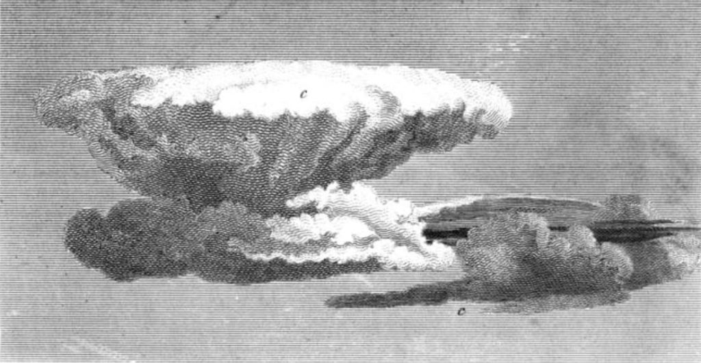 In 1802 the chemist and meteorologist Luke Howard gave a paper to the Askesian Society in London on the forms of clouds. In the paper, published in the Philosophical Magazine the following year as ‘On the Modifications of Clouds’, Howard coined the Latin cloud names that are still in use today: cumulus, cirrus, stratus, nimbus, and their various combinations. His innovation was in showing how clouds were not, as had long been assumed, random in their shapes and movements, “the sport of winds… ever varying, and therefore not to be defined”, but followed recognisable patterns and proceeded through a series of identifiable forms.1