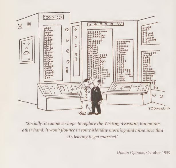 During the postwar era, the ethical and practical consequences of computerisation began to be scrutinised by writers and artists, not least by those who were also civil servants and thus experienced administrative mechanisation first hand. As Max Weber notes, depersonalisation is ingrained in the very logic of bureaucratic rationality. However, where discretion may be exerted by state functionaries there is also humanity in bureaucracies. The advantages and disadvantages of administrative digitalisation are weighed against each other in a cartoon by T. J. Donnelly (Fig. 2) published in the October 1959 issue of the Irish magazine Dublin Opinion, without settling the question of whether administrative computer systems are preferable to feminized “Writer Assistants”.