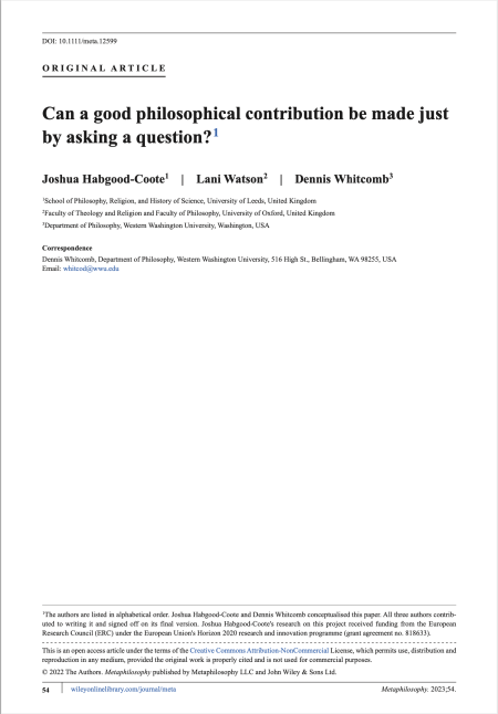 - Joshua Habgood-Coote, Lani Watson, and Dennis Whitcomb (2023): Can a good philosophical contribution be made just by asking a question?, in: Metaphilosophy, vol. 54, no. 1, p. 54. https://doi.org/10.1111/meta.12599.