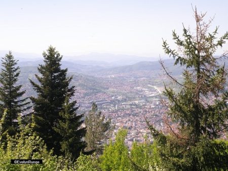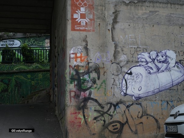 Hier also hat die serbische Armee gesessen, gelegen, geschossen, vom Berg Trebević herab nach Sarajevo, April 1992 bis März 1996, 1425 Tage, vier Jahre. Die Armee der Republika Srpska (VRS) hatte auf dem Trebević Artilleriestellungen bezogen, hier wurde der Seilbahnarbeiter Ramo Biber als einer der ersten zu Kriegsbeginn erschossen, und bis in die 2010er-Jahre waren Berghänge vermint. Die Überreste der Bobrennbahn der Olympischen Spiele 1984 sind mit Graffiti besprüht. Hat die Zeit Löcher in ihren Beton gegerbt oder sind dies Schusslöcher? Und die Ruinen, die von der neuen Seilbahn aus in den Ausläufern der Stadt zu sehen sind, werden sie eines Tages renoviert?