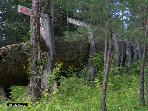 Wie war es, 1992 bis 1996 hier zu überleben? Die Berge immer im Blick, wissend, dass dort ebenso wie in Hochhäusern serbisches Militär stationiert ist. Ich schaue zu den Bergen, die Berge schauen zu mir: Der Trebević ist beliebt als Naherholungsgebiet, und Kriegsruinen wie die Sternwarte Čolina Kapa sind von der Bergstation „Ramo Biber“ einen Spaziergang entfernt. Träume, Čolina Kapa und die bemooste Bobbahn wieder als solche zu reaktivieren, sind bislang nicht in handfeste Pläne und Bauten übergegangen. In meinen Fotos sehe ich die Landschaft, bemooste Steine, eine in der Sonne glänzende Plastikfolie wie ein Leichensack, enge Wege durch dichten Wald, Schattenspiel und Sonnenlicht, weißgemalte Figuren-Logos der Fußgängerwege wie Silhouetten von Toten auf Asphalt, Pusteblumen, Betonpfeiler der Bobbahn wie Zaunpfosten mit Stacheldraht, hinter dem Männer ausmergeln; und in der Bergbahnstation eine Spiegelung in der Scheibe wie Ramo Bibers Geist.