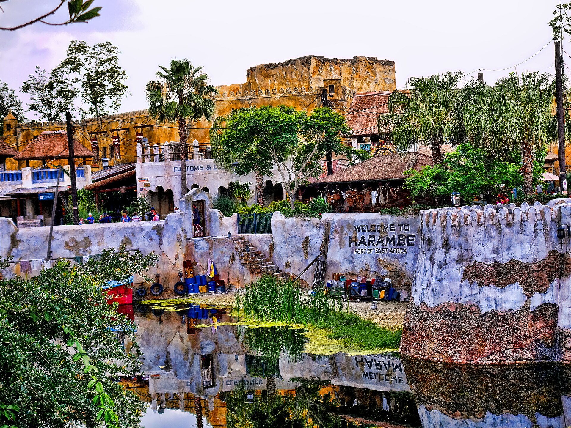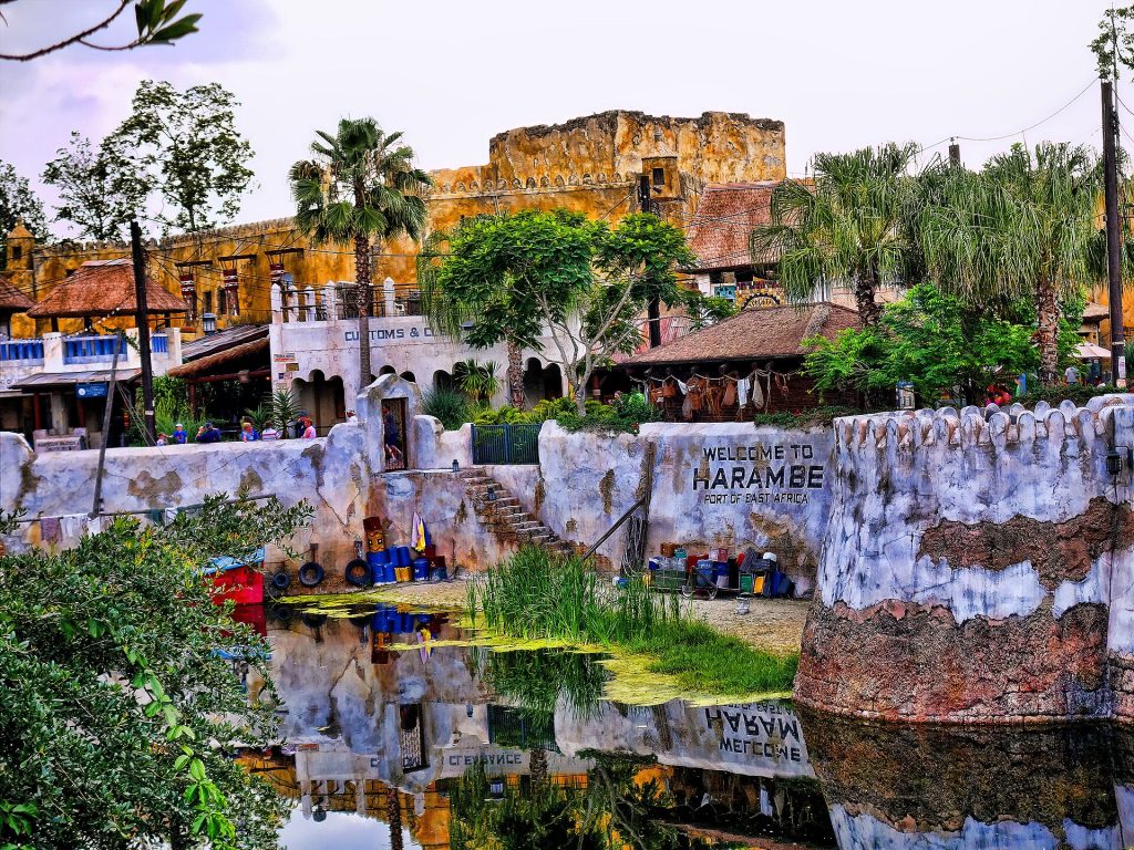 Theming creates a sense that the customer walks into another world, where every object in the built environment contributes to an on-going narrative or ambience. For example, the themed land Harambe in Disney’s Animal Kingdom is made to resemble an East African port village, telling the story of the preservation of wildlife from poaching and habitat destruction. It does so through architecture, ride design, landscaping, signage and the performance of its employees. Theming reaches far beyond theme parks, however: a restaurant styled to look like a 1920s speakeasy, a hotel with rooms decorated with rock-and-roll imagery, or a casino with Egyptian pyramids and mummies are all possibilities for themed entertainment.