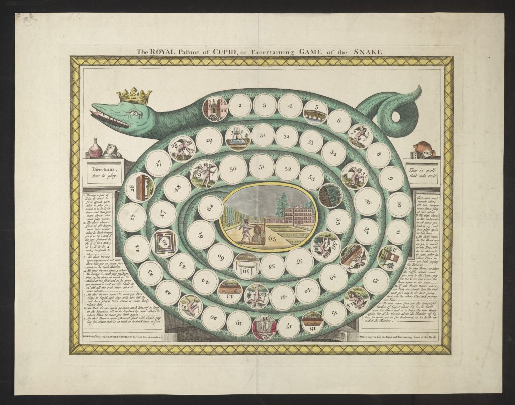 Board games also have a history of edifying messages that serve as themes. Gyan chaupar (better known as snakes and ladders in the West) is a dice game that teaches about spiritual enlightenment and the freedom from rebirth. Science in Sport or the Pleasures of Astronomy is a game developed in 1804 by John Wallis extolling the virtues of stargazing. Despite rich opportunities for storytelling, theming can also serve as little more than window dressing on the same game mechanic. A famous example is The Royal Game of Goose, one of the earliest styles of board games (roll-and-move or race games), which has been reskinned so many times that its variations fill a whole book.